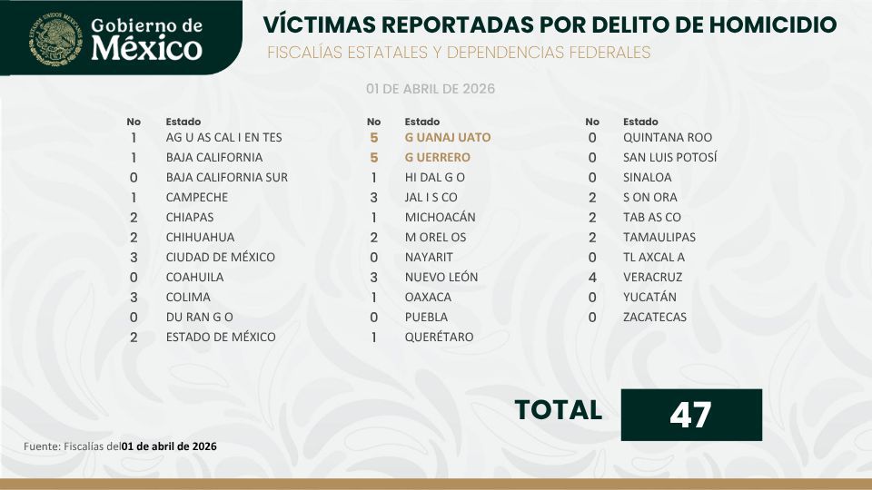 El Gobierno del Estado de Nayarit, encabezado por el gobernador Miguel Ángel Navarro Quintero, informó que, de acuerdo con el reporte más reciente del Gobierno de México sobre víctimas por delito de homicidio doloso, correspondiente al 01 de abril de 2026, la entidad registró cero víctimas en este rubro durante esa jornada.