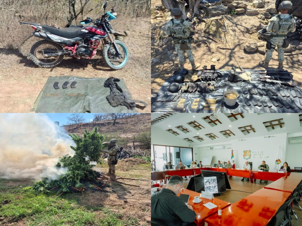 Como parte de los resultados, destacan acciones conjuntas del Ejército Mexicano, la Guardia Nacional, la Secretaría de Marina y la Policía Estatal, que derivaron en aseguramientos de armamento, cartuchos, droga, vehículos y dispositivos ilícitos, así como la desarticulación de campamentos utilizados por grupos delictivos.