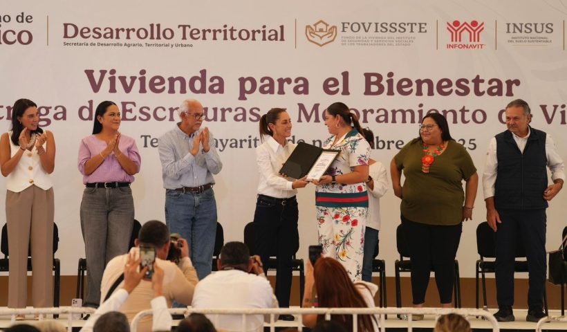 La presidenta de México, Claudia Sheinbaum Pardo, encabezó en el Parque La Loma de la capital nayarita el evento “Vivienda para el Bienestar. Entrega de…